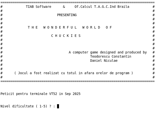 - Jocul rula în sistemul de operare CP/M și a fost realizat în limbaj de asamblare pe calculatoare M18 cu console VDT de domnul ing. Teodorescu Constantin și domnul ing. Daniel Niculae (TIAB Software și Of. de Calcul T.A.G.C.Ind. Brăila). A existat și un editor de niveluri, care s-a pierdut în timp împreună cu sursele de cod ale jocului.